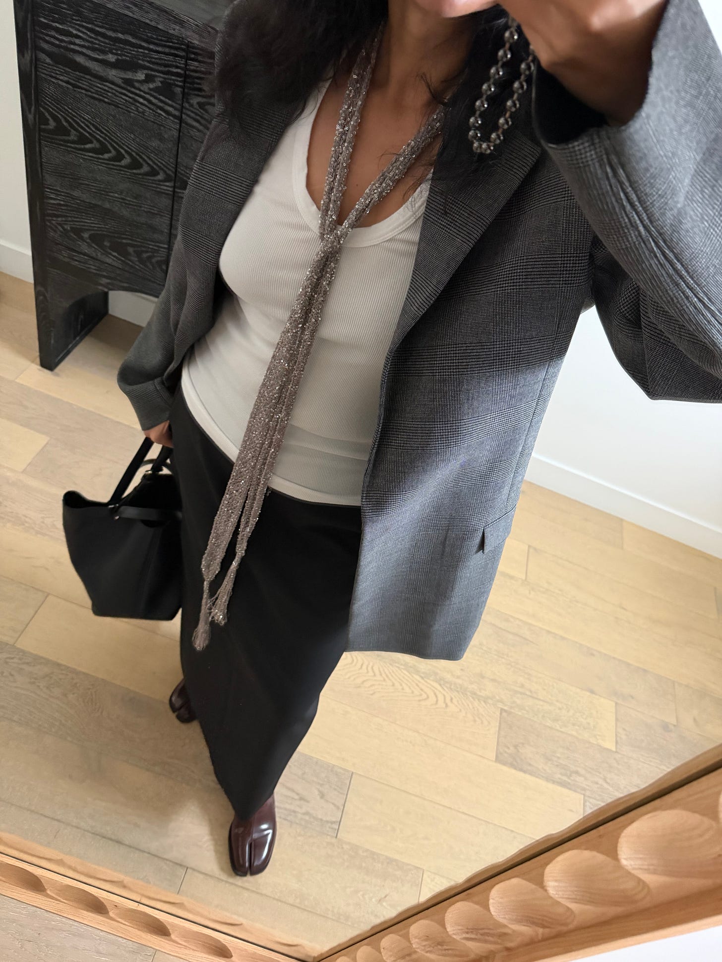 I had wanted to wear the Balenciaga pointy shoulders blazer. Had been craving it all week. Got dressed, looked in the mirror, and as I was heading out the door something felt off. I think the structure was too much for what I was walking into. I took it off and threw a cardigan on instead, ending up with the cardigan, black maxi skirt, white tank, long crystal scarf, burgundy loafers. Softer, and more held just felt better for this day somehow. Here’s it in action:
