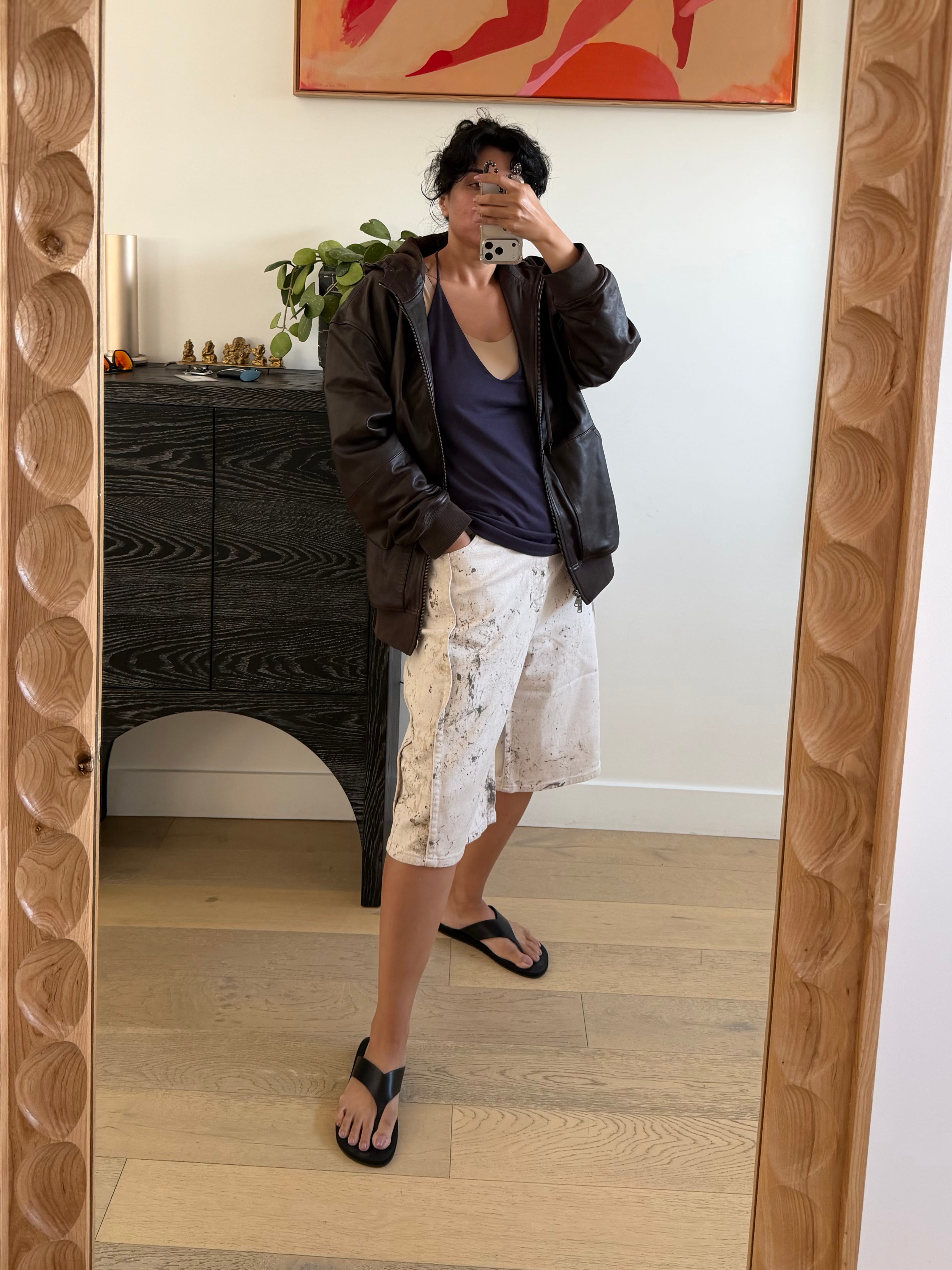 For the day I wore the red winslows with a blue shirt which is? Yup, another dissonant combination, cool blue against hot red, vibrating and a little uncomfortable in a good way. The Row flippity-flops! In the evening I changed into my new paint-splattered denim shorts with a tank layered under the leather hoodie because it got chilly. The leather hoodie is so perfect for LA weather, I have been wearing it daily for my evening walk.