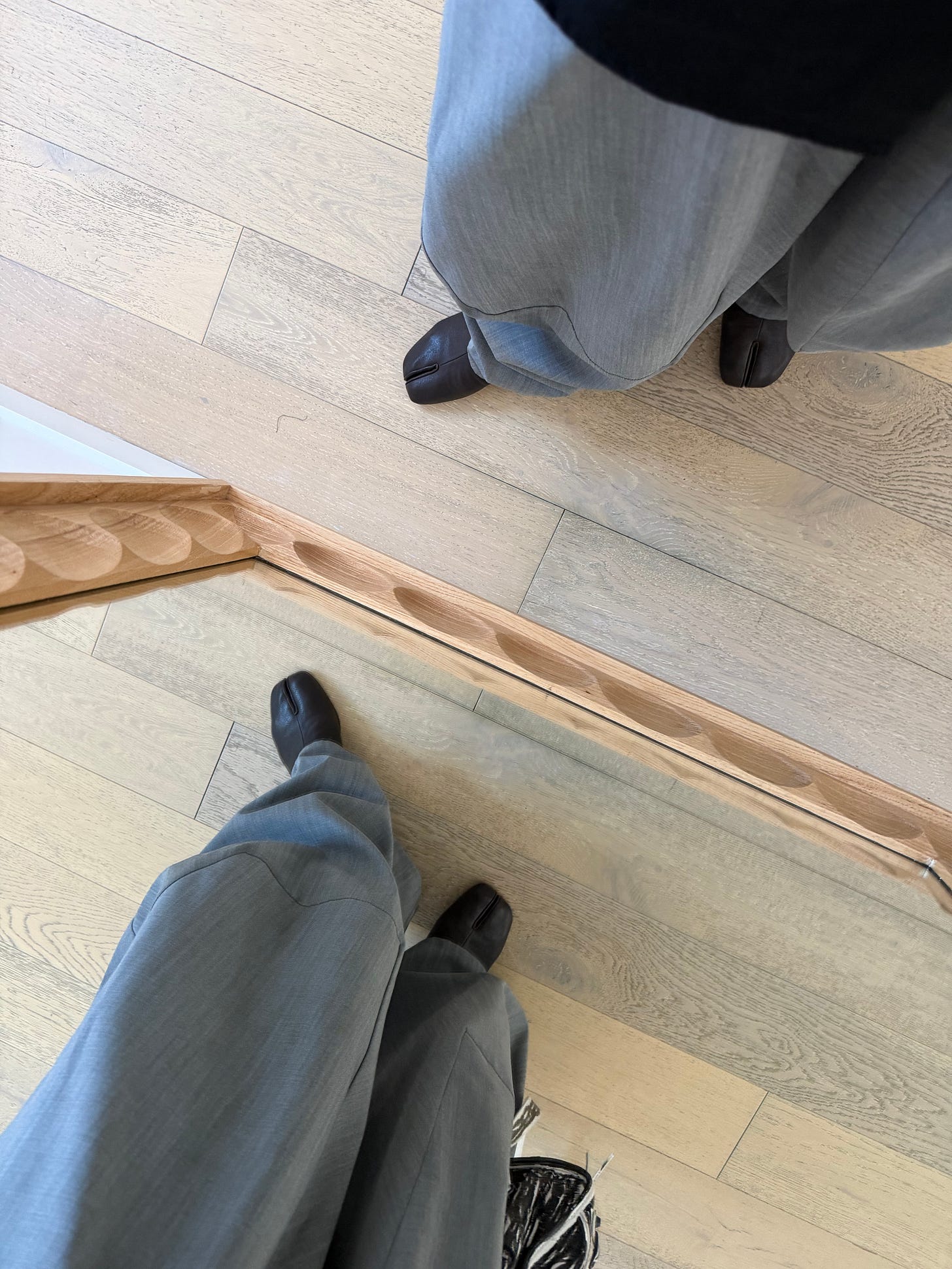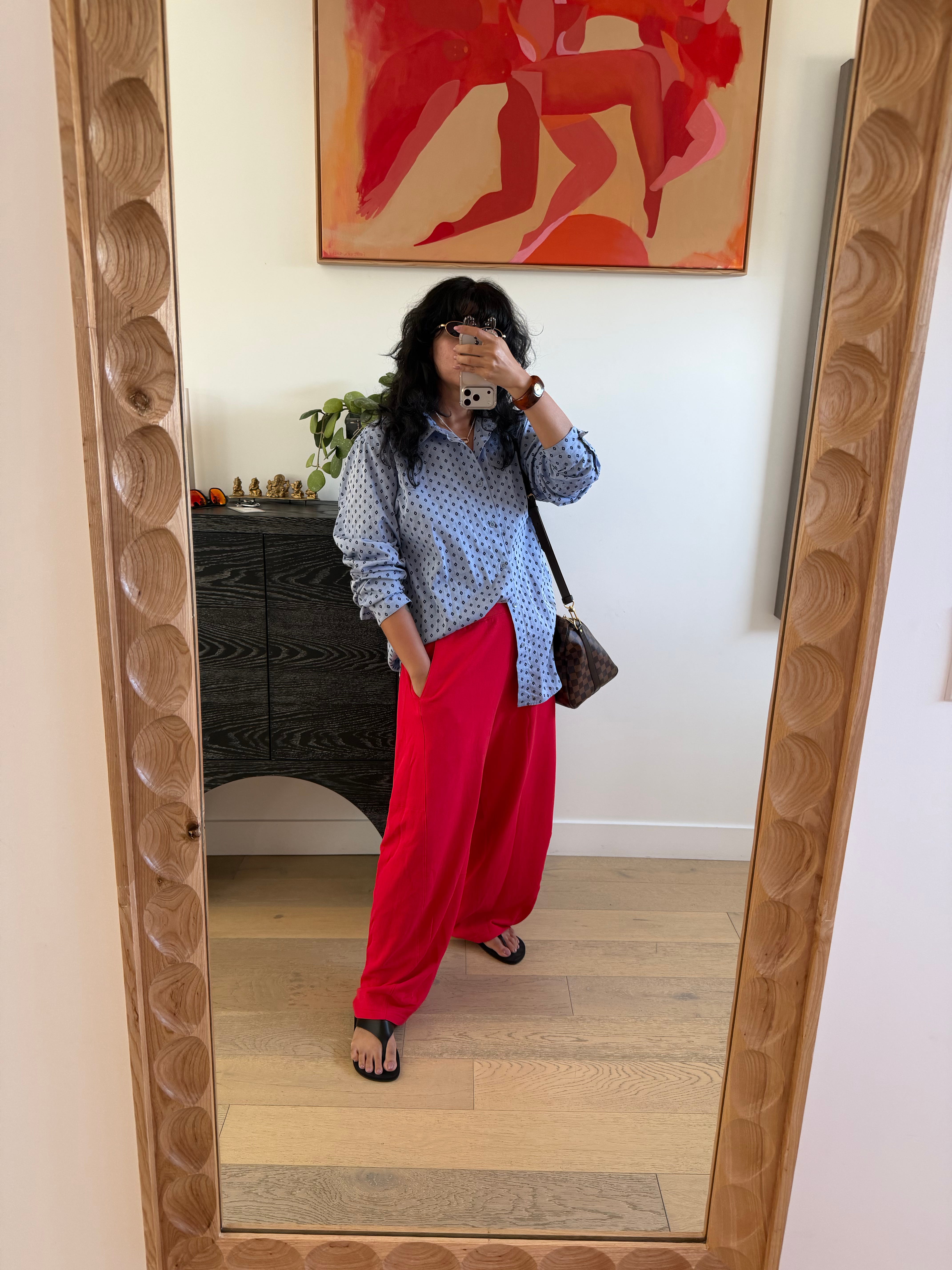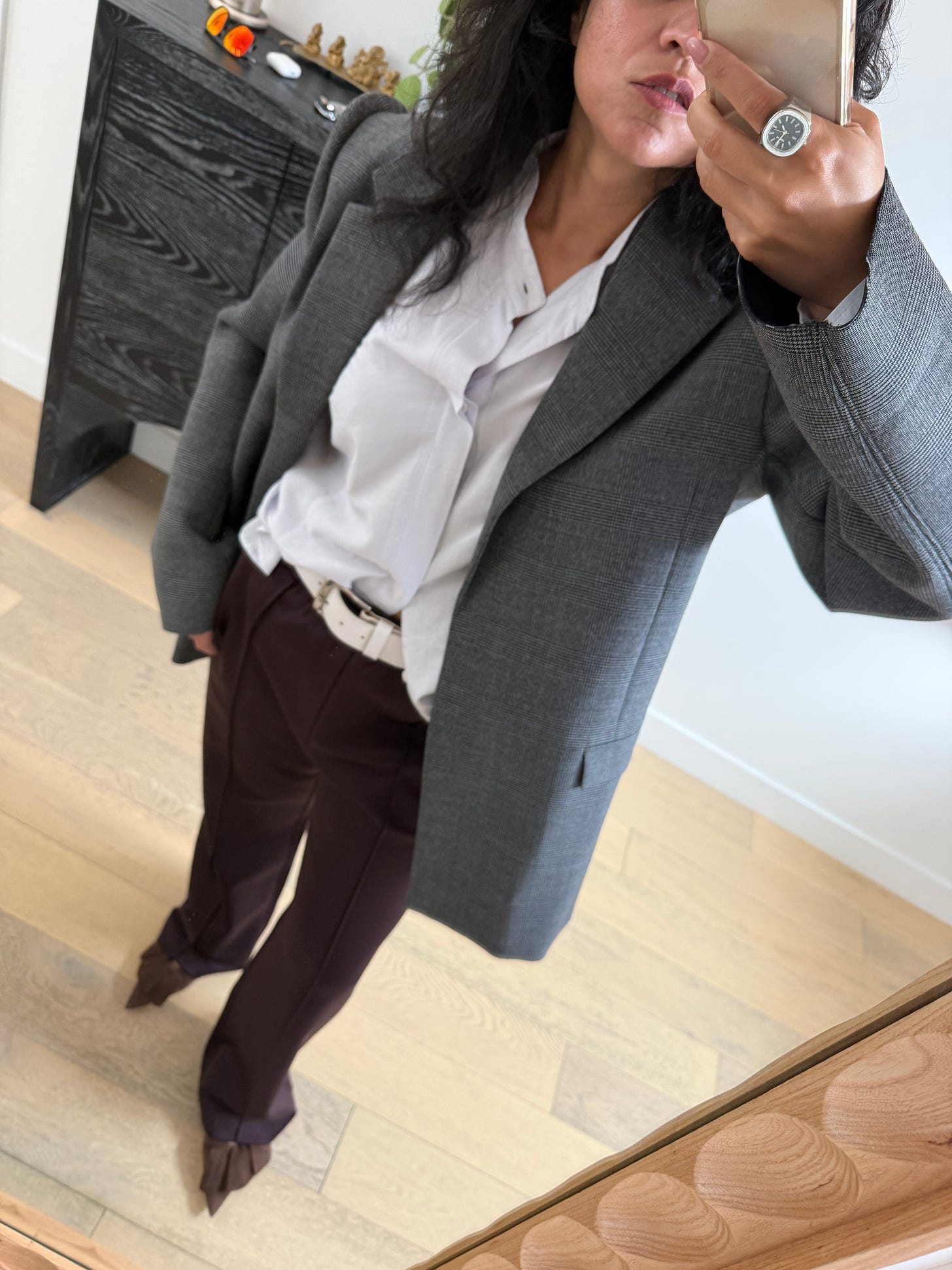 It’ll be fine and productive, I know that! Whenever I actually do these trips I’m fine with them. But Thursday had that specific energy of a week that was almost over and then got a little longer. I finally got the Balenciaga blazer moment right though! Track pants that look more formal, easy shirt, white belt, blazer on top, colors I really liked. Really, really liked how this came together.