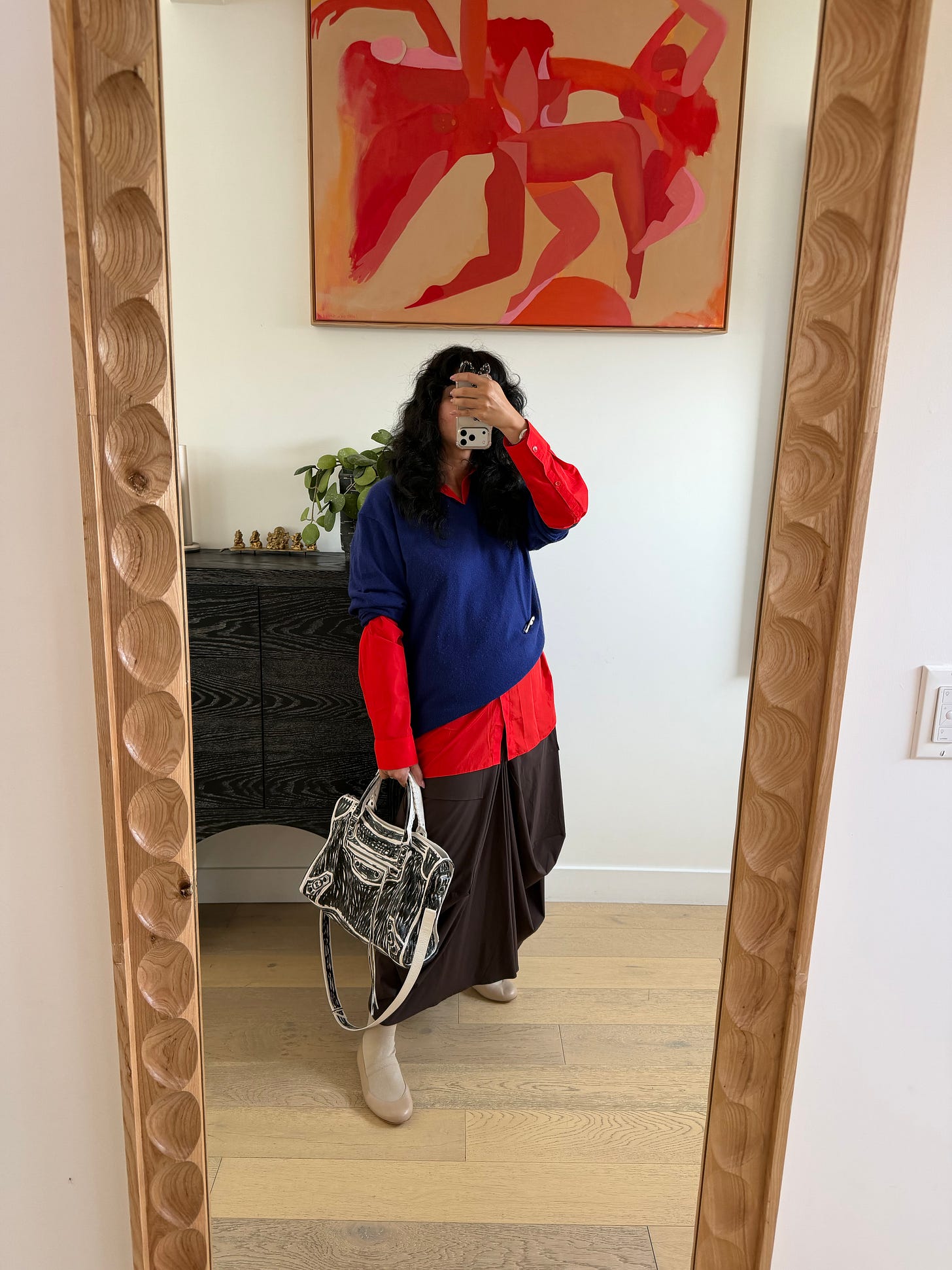 The color combination was the best part. Cobalt-ish sweater layered over a red shirt, dark chocolate skirt, cream boots. I call these dissonant colors, combinations that really shouldn’t work and are almost uncomfortable to look at but somehow do anyway. The Balenciaga printed city bag in black and white against all of that red and faded cobalt felt exactly right.
