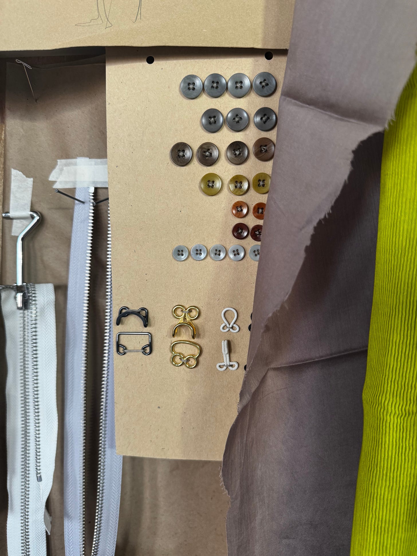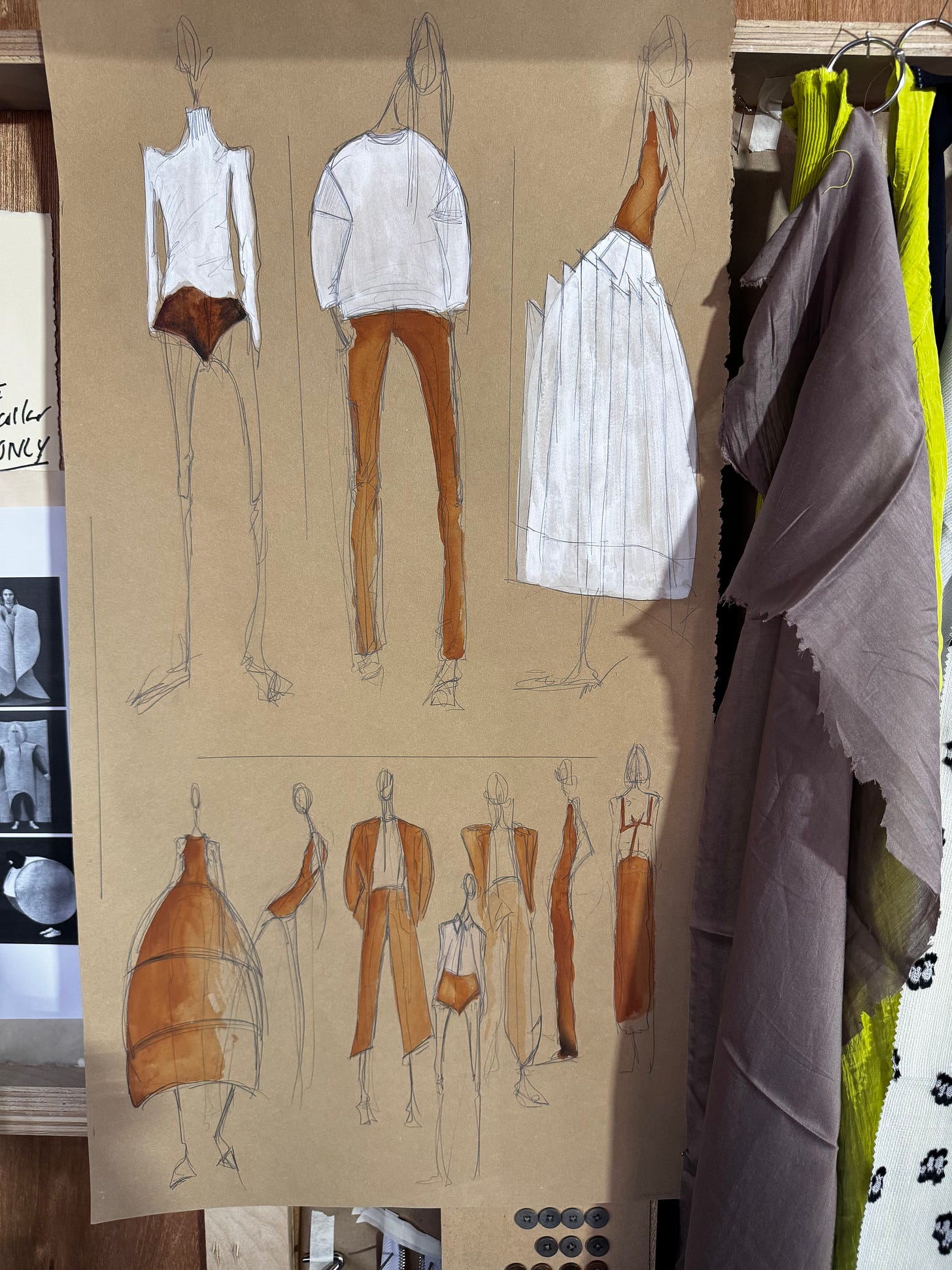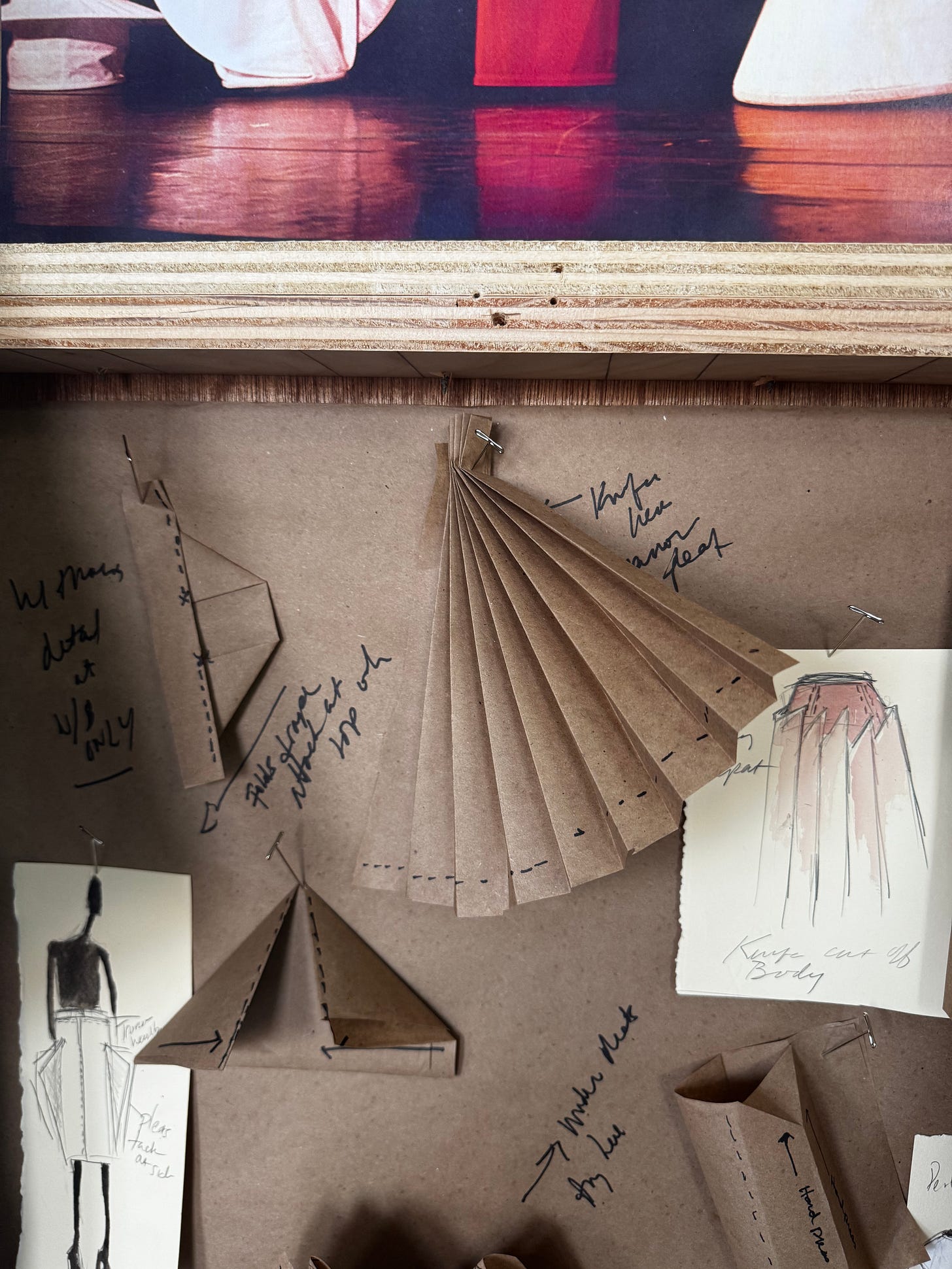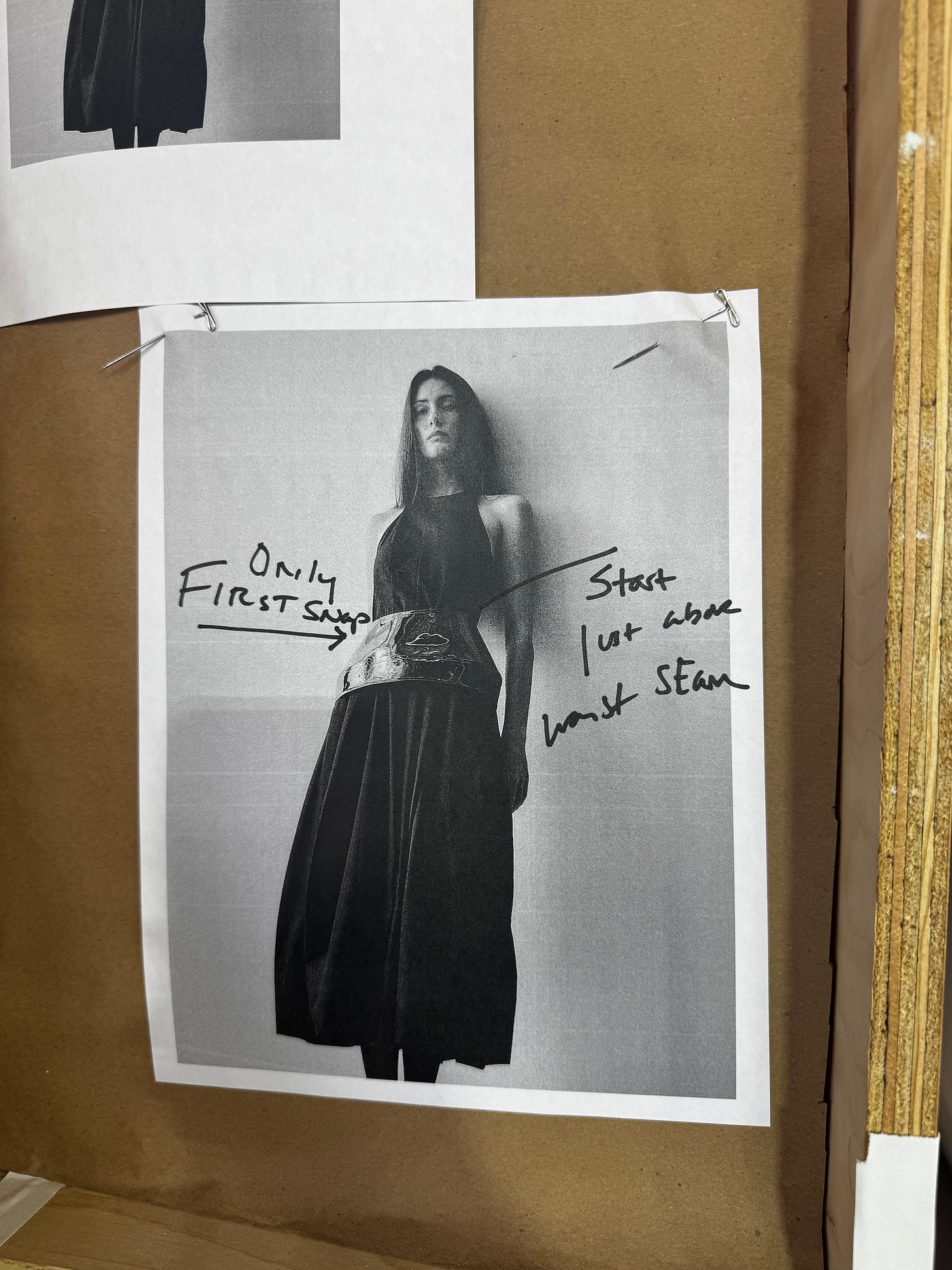 But what made it even more compelling was hearing Amy talk about how she and Traci built it. Traci starts with shape — literally working fabric on the form until it feels right. Amy starts with words — what’s shifting, what feels stagnant, what needs to evolve. This season, those two processes met at some fascinating references: Brutalist and Bauhaus architecture on Amy’s side, Ursula Sax’s Geometric Ballet on Traci’s.