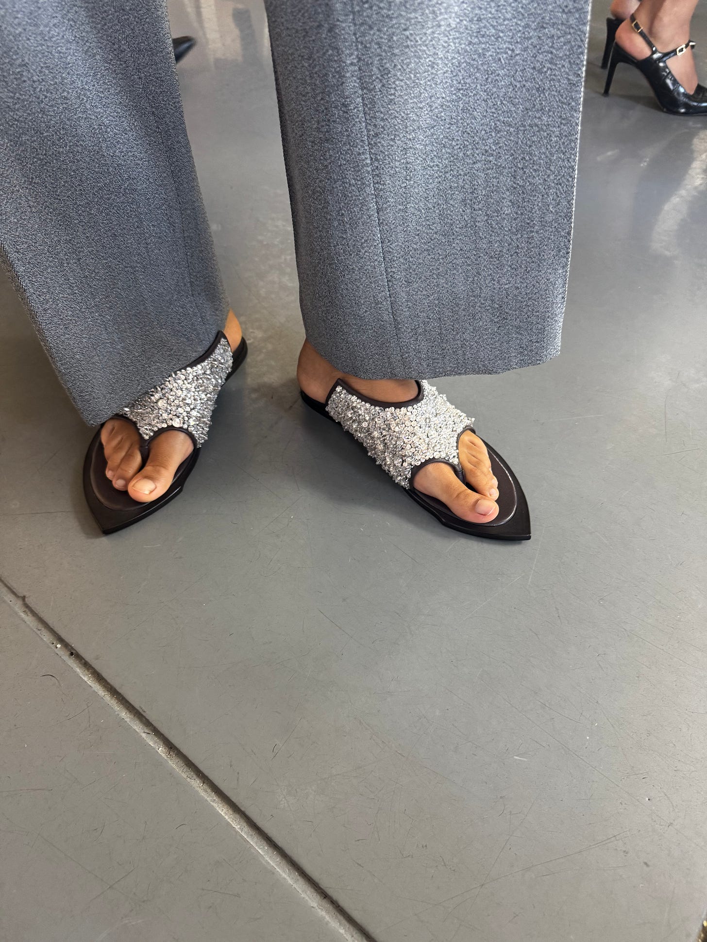 The sandals. Everyone was buzzing about them. Sparkling, embellished, impossible to ignore. Amy told me she had the beading done in India, then assembled in Italy, because no one else was doing it to her standards. And honestly? Genius. I might be biased, but no one does embellishment like India. Dries, Gucci — they all know where to go.