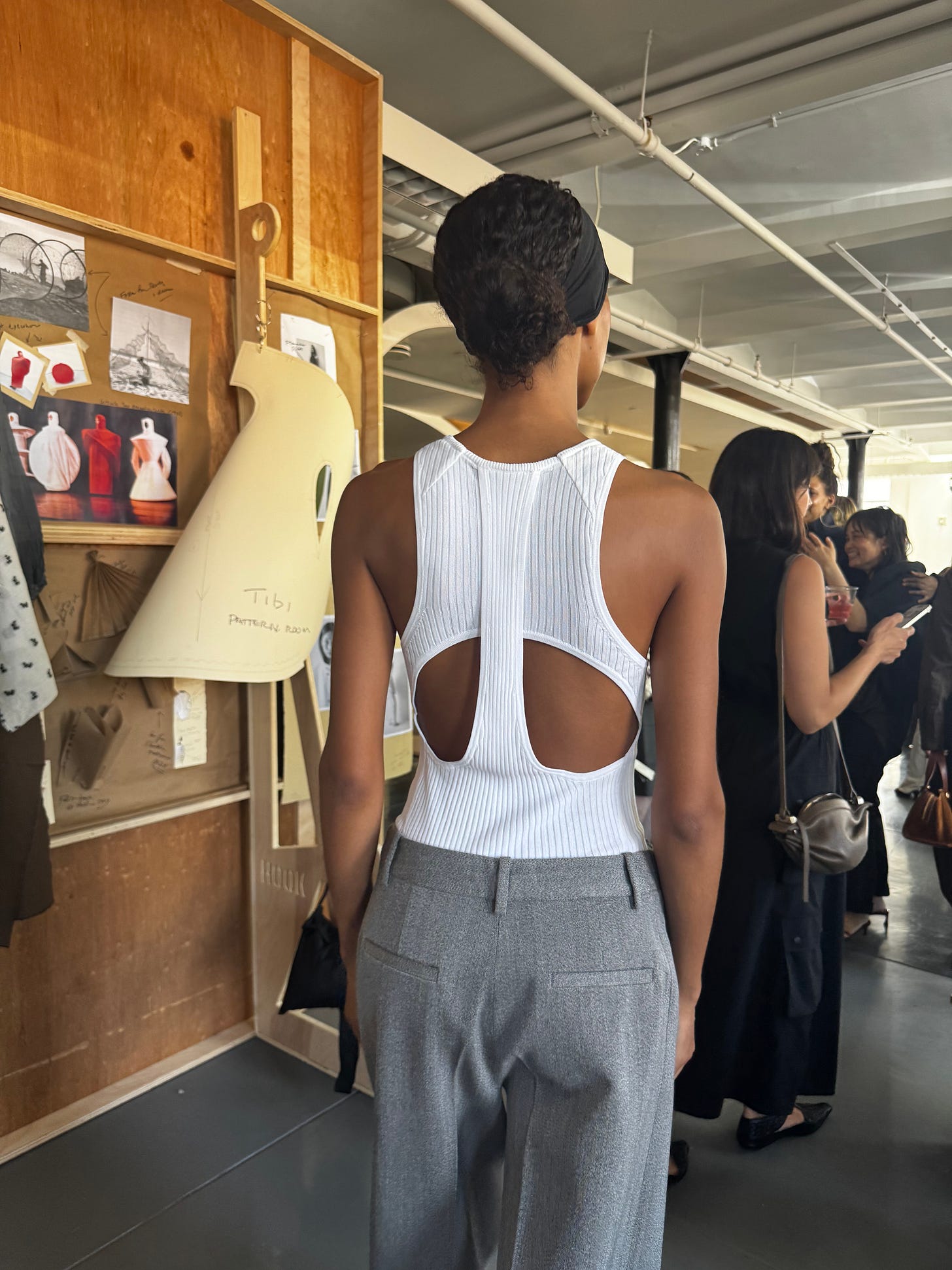 Honorable mentions not available for pre-order yet: the double-seam shoulder shirt (basically my dream silhouette), tanks with sculptural backs, and those 90s-inflected details pushed forward in the most Tibi way. And the ultrasuede sids, did I talk about those already?