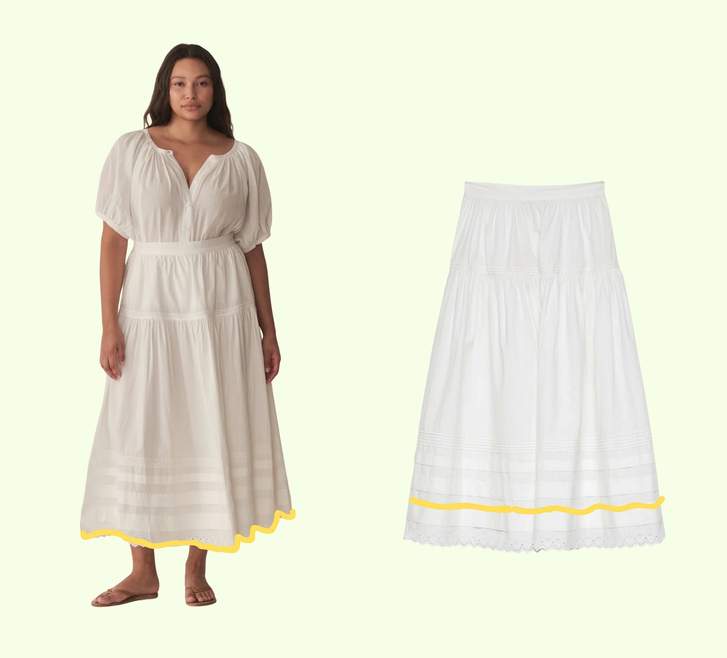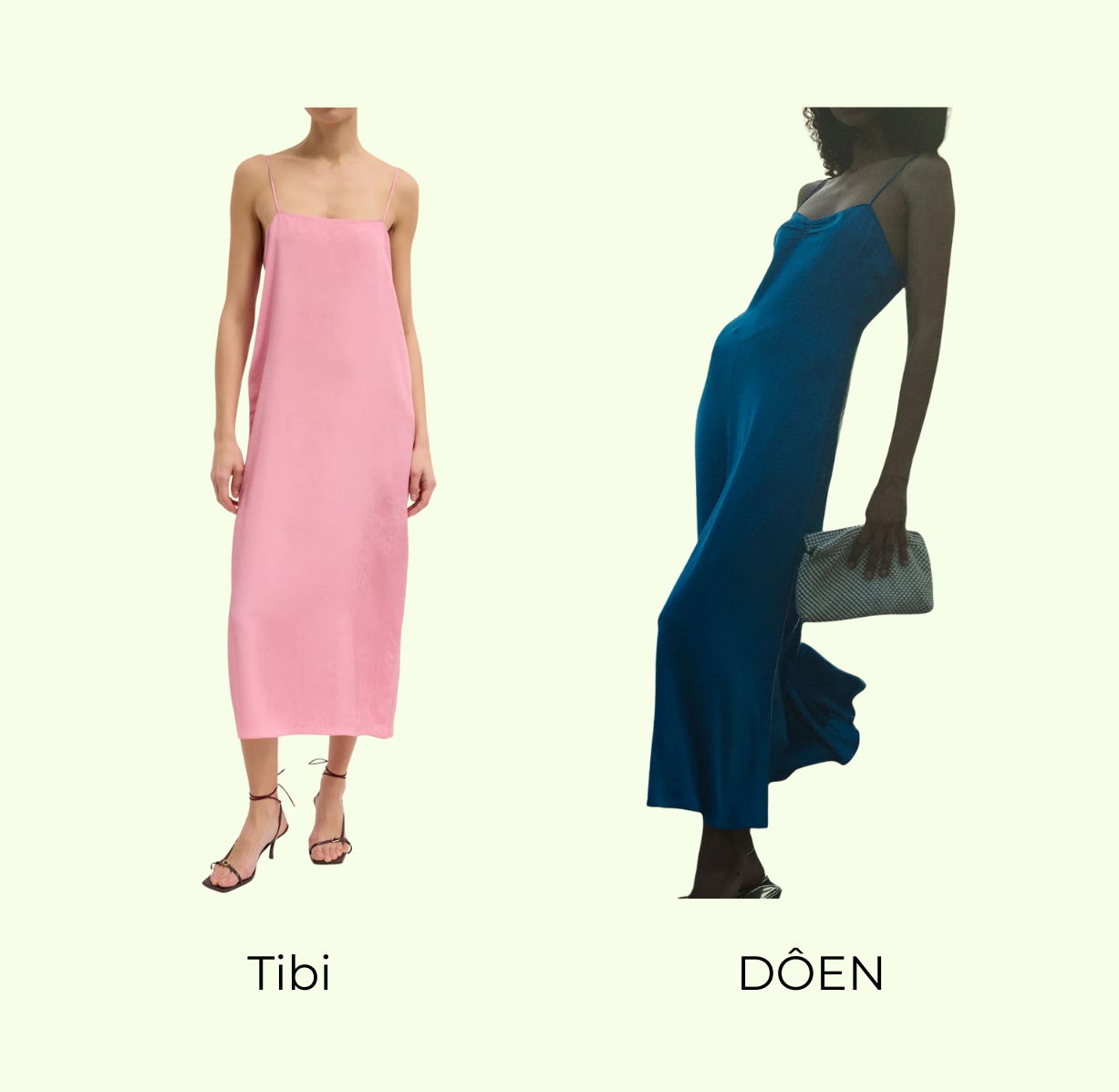 Let’s look at a slip dress by each designer. We’ll start with the flatlays where the design intention is most visible and then look at what shifts once they’re on the body.