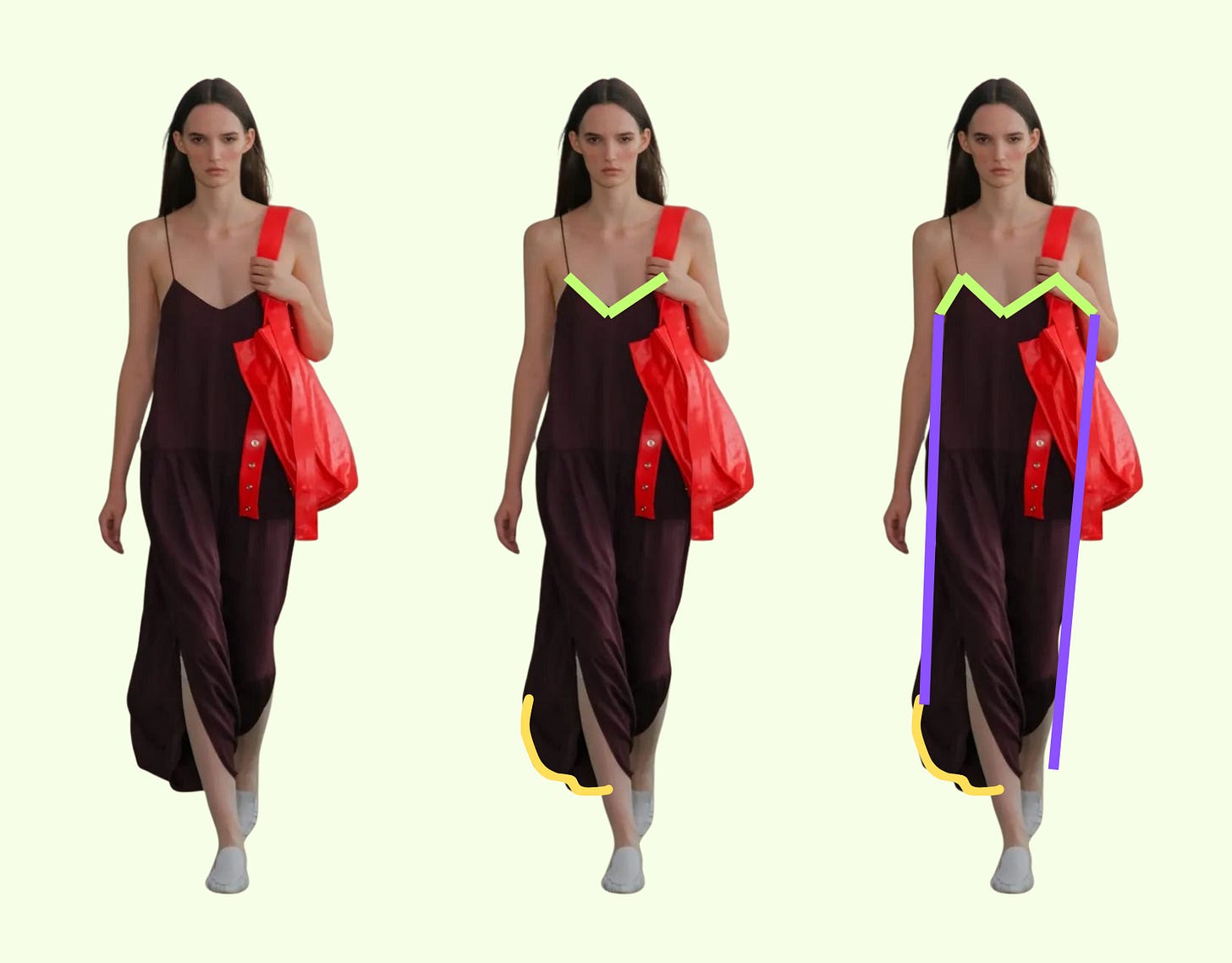 The shape of a garment isn’t fixed. It shifts in motion, in context, and especially on the body. And even within a narrow category like slip dresses, you can see completely different emotional messages just through the direction of lines and the structure of shapes.